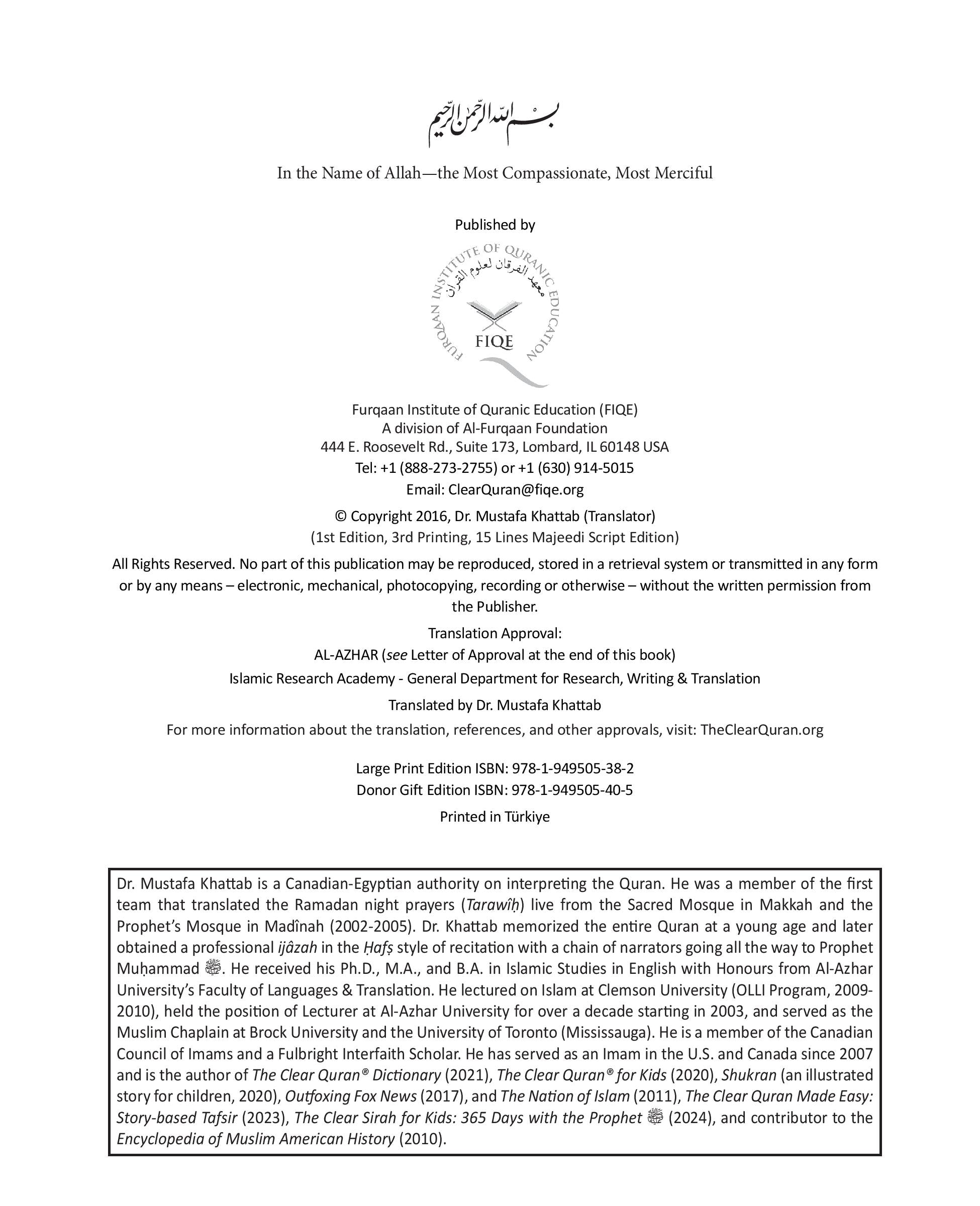 Dr. Mustafa Khattab is a Canadian-Egyptian authority on interpreting the Quran. He was a member of the first team that translated the Ramadan night prayers (Tarawîá ¸ ¥) live from the Sacred Mosque in Mecca and the Prophet’s Mosque in Medina (2002-2005). Dr. Khattab memorized the entire Quran at a young age, and later obtained a professional ijâzah in the á ¸ ¤afá ¹ £ style of recitation with a chain of narrators going all the way to Prophet Muá ¸ ¥ammad ï · º. He received his Ph.D., M.A., and B.A. in Islamic Studies in English with Honours from Al-Azhar University’s Faculty of Languages & Translation. He lectured on Islam at Clemson University (OLLI Program, 2009-2010), held the position of Lecturer at Al-Azhar University for over a decade starting in 2003, and served as the Muslim Chaplain at Brock University (2014-2016) and UTM (2019-2021). He is a member of the Canadian Council of Imams and a Fulbright Interfaith Scholar. He has served as an Imam in the U.S.A. and Canada since 2007 and is the translator of The Clear Quran (2015), the author of The Clear Quran® for Kids (2020), The Clear Quran® Dictionary (2021), Shukran (an illustrated story for children, 2020), The Nation of Islam (2011), and Outfoxing Fox News (2017), and contributor to the Encyclopedia of Muslim American History (2010).