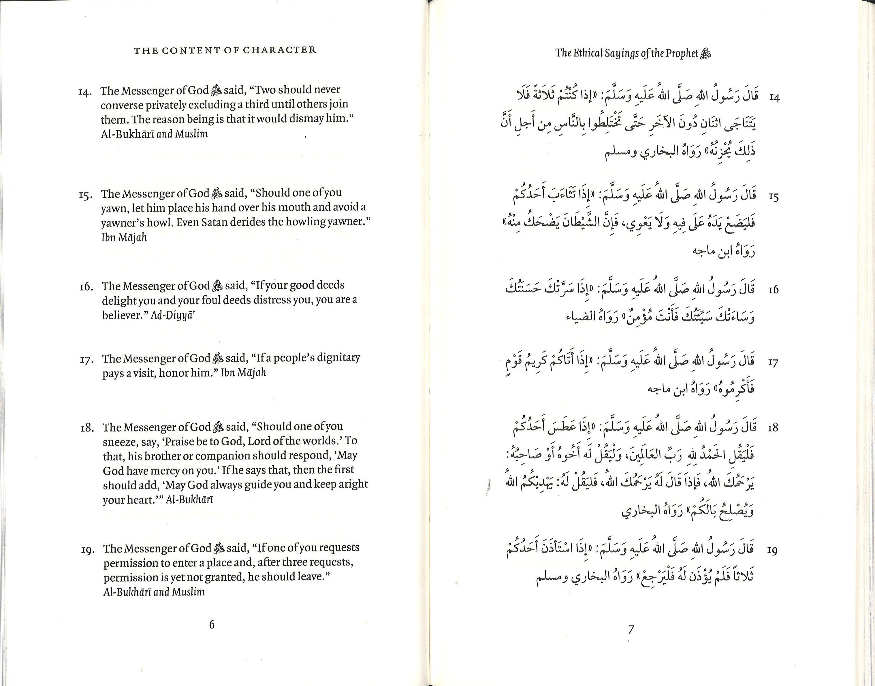 This book contains a selection of sayings (hadiths) of the Prophet Muhammad (May Allah Bless him and Grant him peace) related to one's character. Simple but full of wisdom, these sayings can benefit everyone, regardless of their religion.