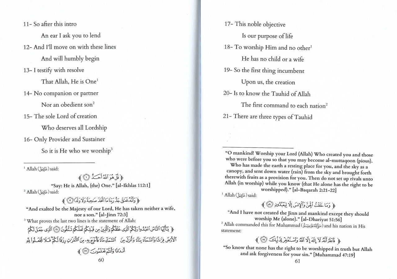 In seeking to follow in the footsteps of some of the Imams of Islam who clarified matters of the islamic belief system by way of poetry, such as Ibn Abee Dawud (d.316H) in his Haa'iyah, al-Nuniyyah by al-Qahtaani (d.383H0, al-Laamiyyah attributed to Shaykhul Islam ibn Taymiyyah (d.728H0, al-Kaafiyah al-Shaafiyah by Ibn al-Qayyim (d.751H), and Sullam al-Wusool fi 'Ilm al-Usool by Shaykh Haafidh al-Hakami (d.1377H), I have composed the following lines of poetry in the English language on some of the core beliefs of the Muslim. We ask Allah to make it beneficial for those who hear it and read it. Indeed, He is the All-Hearer, the One Who responds to the supplications.