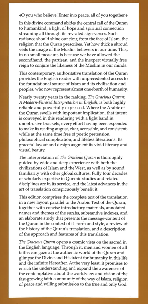 Twenty years in the making, The Gracious Quran: A Modern-Phrased Interpretation of Its Meanings in English is both highly reliable and powerfully expressed. Where the Arabic of the Quran swells with important implication, that intent is conveyed in this rendering with a light hand in unobtrusive brackets, every effort having been expended to make its reading august, clear, accessible, and consistent while at the same time free of poetic pretension, philosophical complication, and lifeless literalisms.