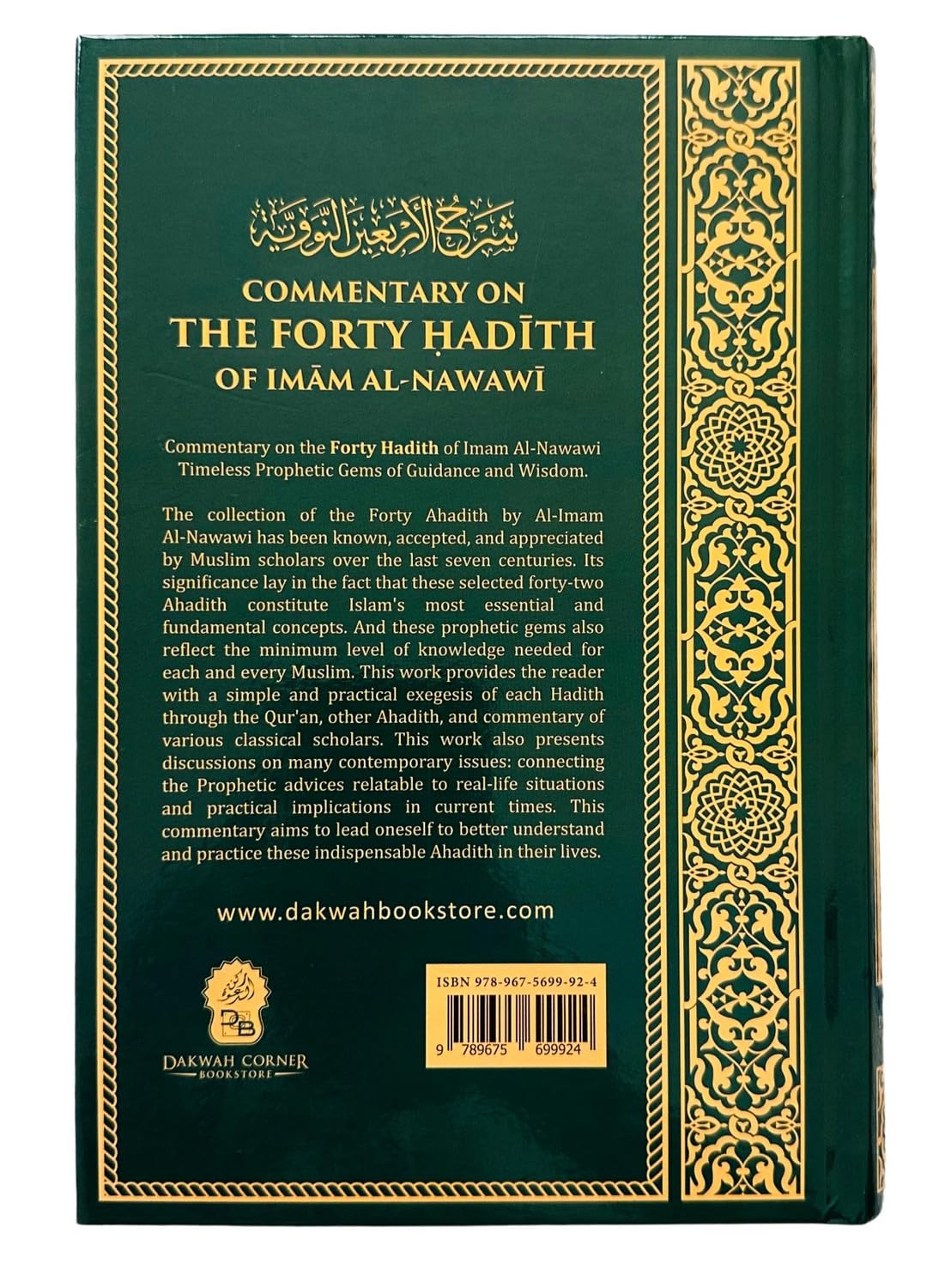 The collection of the Forty Ahadith by Al-Imam Al-Nawawi has been known, accepted, and appreciated by Muslim scholars over the last seven centuries. Its significance lay in the fact that these selected forty-two Ahadith constitute Islam’s most essential and fundamental concepts. And these prophetic gems also reflect the minimum level of knowledge needed for each and every Muslim. This work provides the reader with a simple and practical exegesis of each Hadith through the Qur’an, other Ahadith, and commentary of various classical scholars. This work also presents discussions on many contemporary issues: connecting the Prophetic advices relatable to real-life situations and practical implications in current times. This commentary aims to lead oneself to better understand and practice these indispensable Ahadith in their lives.