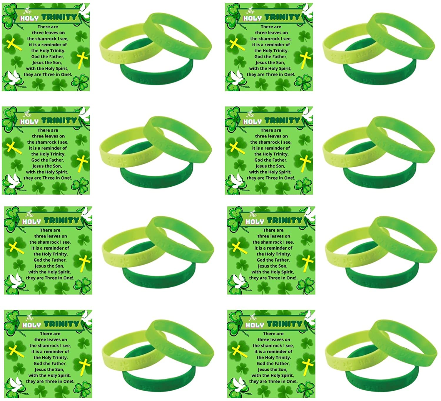Receive a set of 24 bracelets accompanied by 24 informative cards. Elevate your St. Patrick's Day celebrations by ordering these delightful cards along with bracelets, guaranteed to bring a bright smile to your child's face. Dive into the significance of the shamrock with these 24 sets of Holy Trinity cards paired with bracelets, providing insight into the symbolic meaning. These St. Patrick's Day cards perfectly complement any festive games or activities. Embrace the special significance of the St. Patrick's Day Shamrock by distributing these sets to your students, enriching their understanding. Enhance your church supplies by including these cards adorned with bracelets, ideal for spreading joy and knowledge. Crafted from durable silicone rubber, the bracelets are designed to fit most wrists comfortably, each bearing the message 'Happy St. Patrick's Day' alongside embossed shamrocks. Measuring 3' in size, the cards feature an enlightening message: 'There are three leaves on the shamrock I see, it is a reminder of the Holy Trinity. God the Father, Jesus the Son, with the Holy Spirit they are Three in One.' This versatile set is suitable for all ages and educational levels, offering a captivating exploration of the symbolism behind the Shamrock.