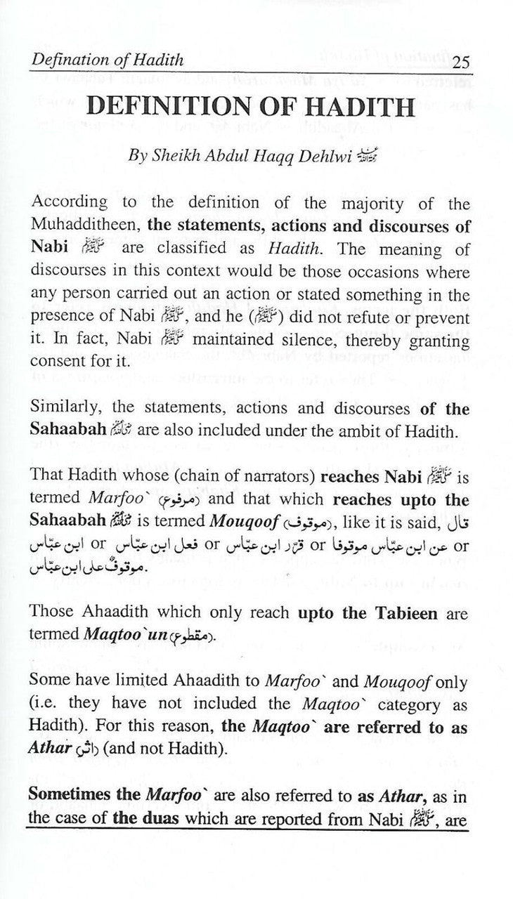 This book is a compilation of three 1. Best Principles by Moulana Khair Muhammad Jlalndhaari (ra) 2. Definition of Hadith by Sheikul Haq Dehlevi (ra) 3. Tahfatul Durar by Allamah Mufti Ahmed Saeed Palanpuri Discussing the methodology of narration and simple basic fundamental of Ahadith for any layman to understand. 'Tahfatud Durar' Sharah of Nakbatul Fikar of Hafiz Askalani (ra)