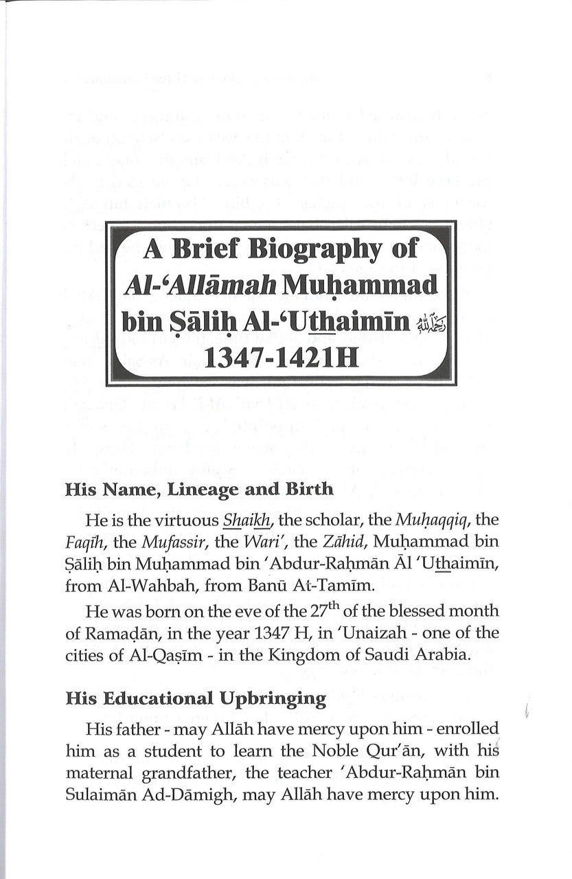 This work is the English translation of Sharh Thalaathatul-Usool, which is an explanation of the booklet Thalaathatul-Usool(The Three Fundamental Principles) written by Shaykh Muhammad ibn Abdul-Wahhaab.