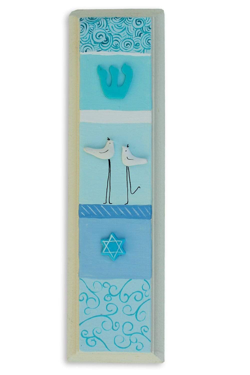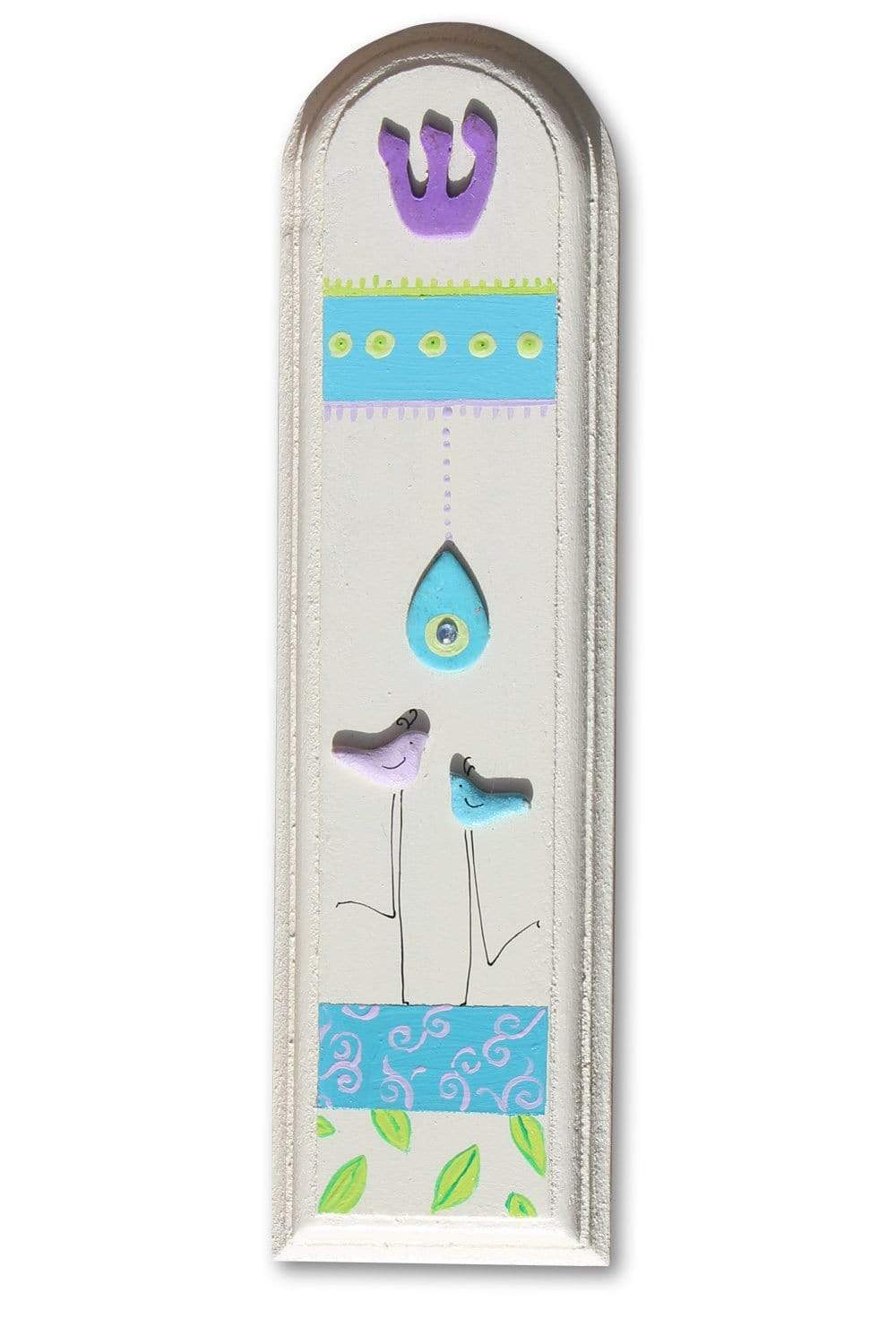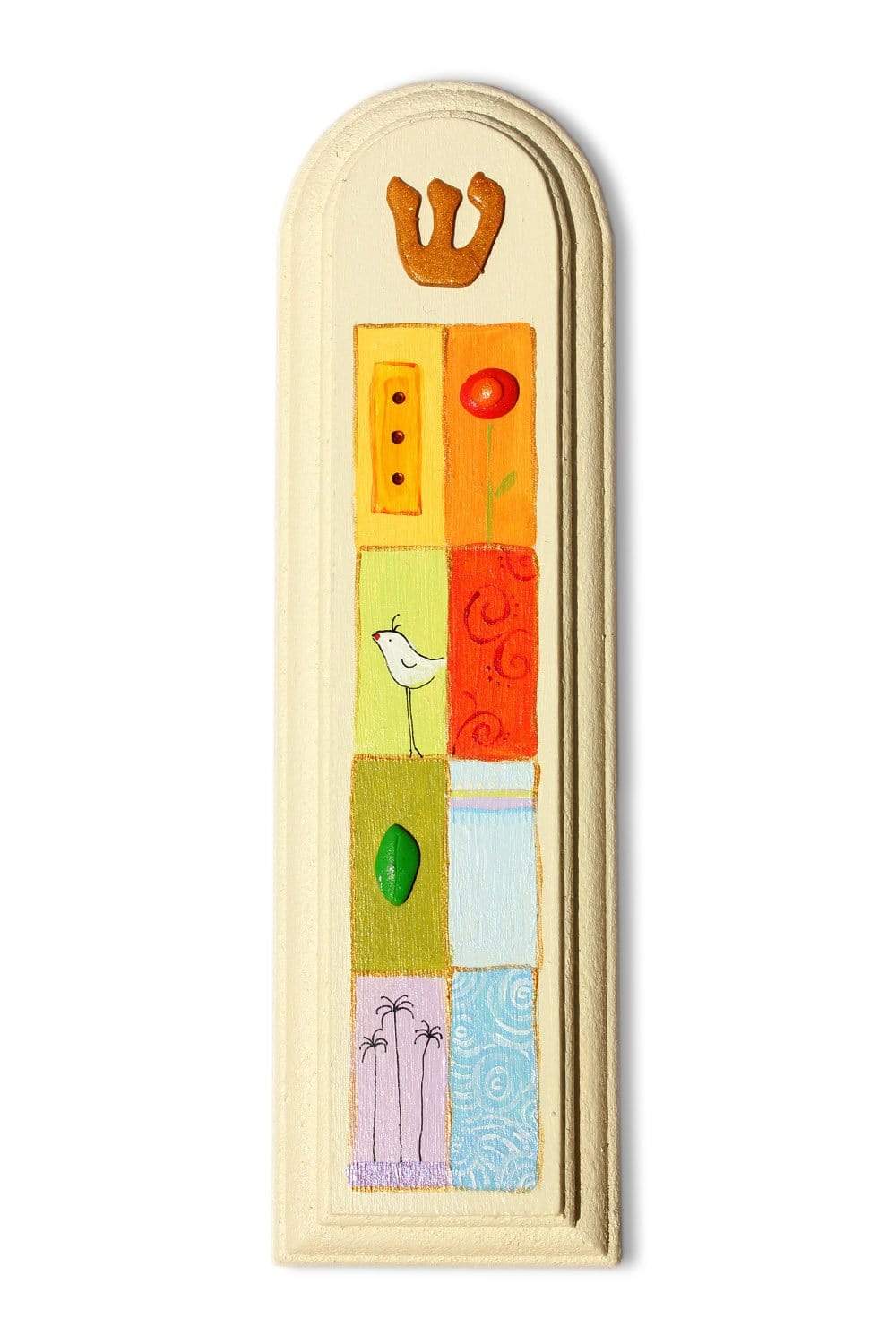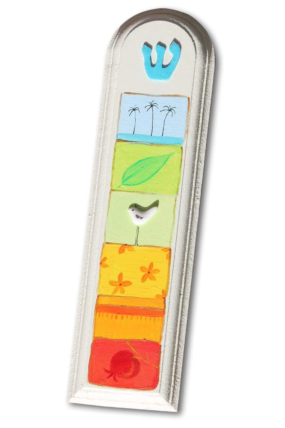 These delightful handmade Mezuzahs are created by Sharon Goldstein of Happy Judaica with acrylic paint on wood. Each depicts a different theme. They are covered with 2 layers of eco-friendly preservative wood finish. The letter 'ש', the biblical name of God, for (Shomer Daltot Yisrael, 'Guardian of Israel's doors'), is at the top of each piece. Each comes with dual-sided tape. Scroll sold separately.