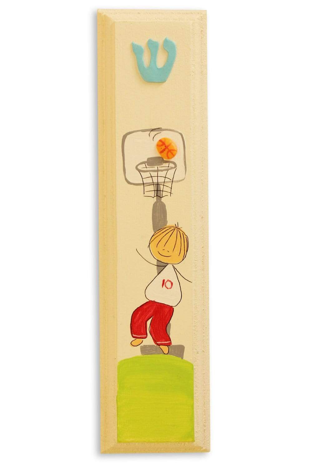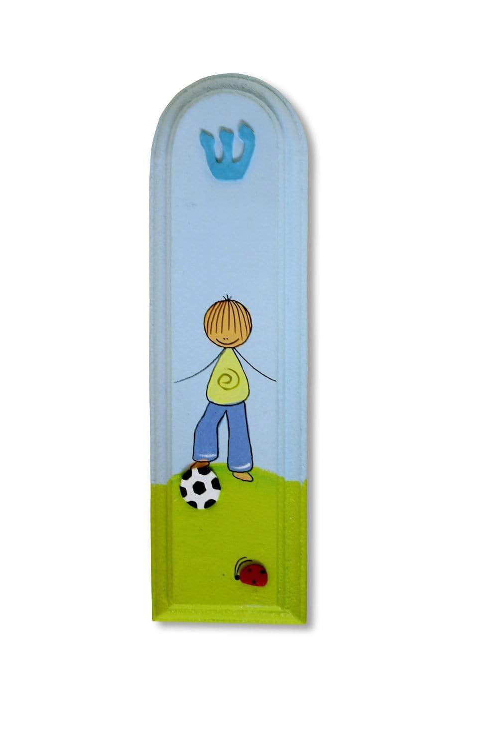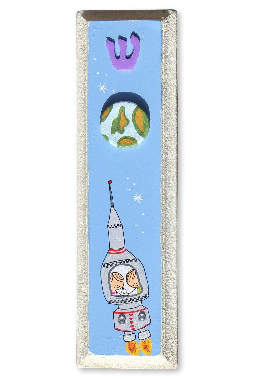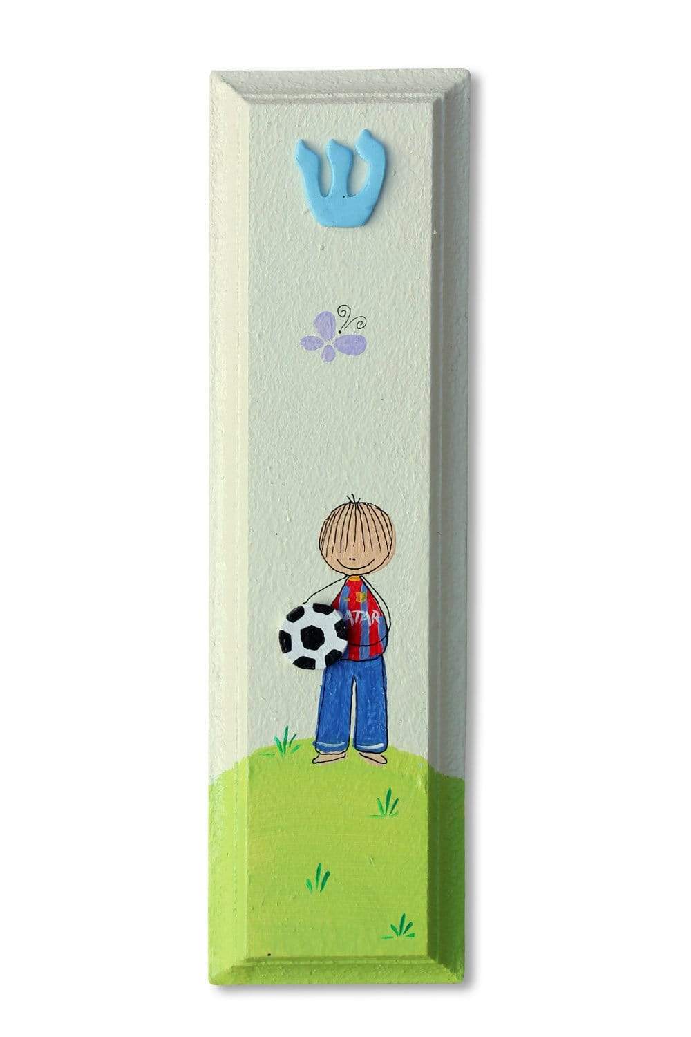 These delightful handmade Mezuzahs are created by Sharon Goldstein of Happy Judaica with acrylic paint on wood. Each depicts a different theme. They are covered with 2 layers of eco-friendly preservative wood finish. The letter 'ש', the biblical name of God, for (Shomer Daltot Yisrael, 'Guardian of Israel's doors'), is at the top of each piece. Each comes with dual-sided tape. Scroll sold separately.