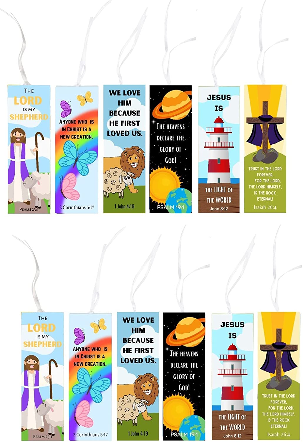 72 Bible inspired bookmarks for kids. There are 6 different designs. The heavens declare the glory of God. Trust in the Lord forever, for the Lord Himself is the rock eternal. We love Him because He first loved us. Anyone who is in Christ is a new creation. Jesus is the light of the world. The Lord is my shepherd. You can use these for the children at your church. The front is colorful and fun. These are 6' in size. The back is blank and all white. The thickness is just right. The front is glossy and smooth, and the back feels and looks just like paper. All the bookmarks come with nice ribbons. These are so cute. These Christian bookmarks for kids are great to accompany candy treats. Decorative bookmarks feature a variety of designs and quotes for religious events. Use in Bible study or at school for students' encouraging and inspiration to learn and implement verses. They make great gifts for students. Use these as gifts to children when they check out library books at church. Give these bookmarks to family and friends for birthday favors. Great variety for vacation Bible school.