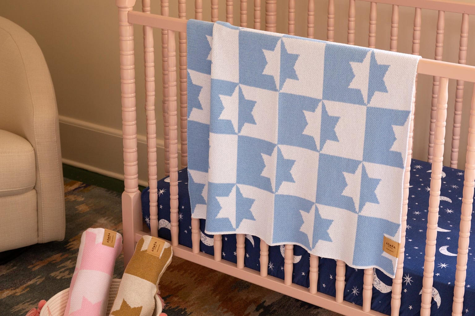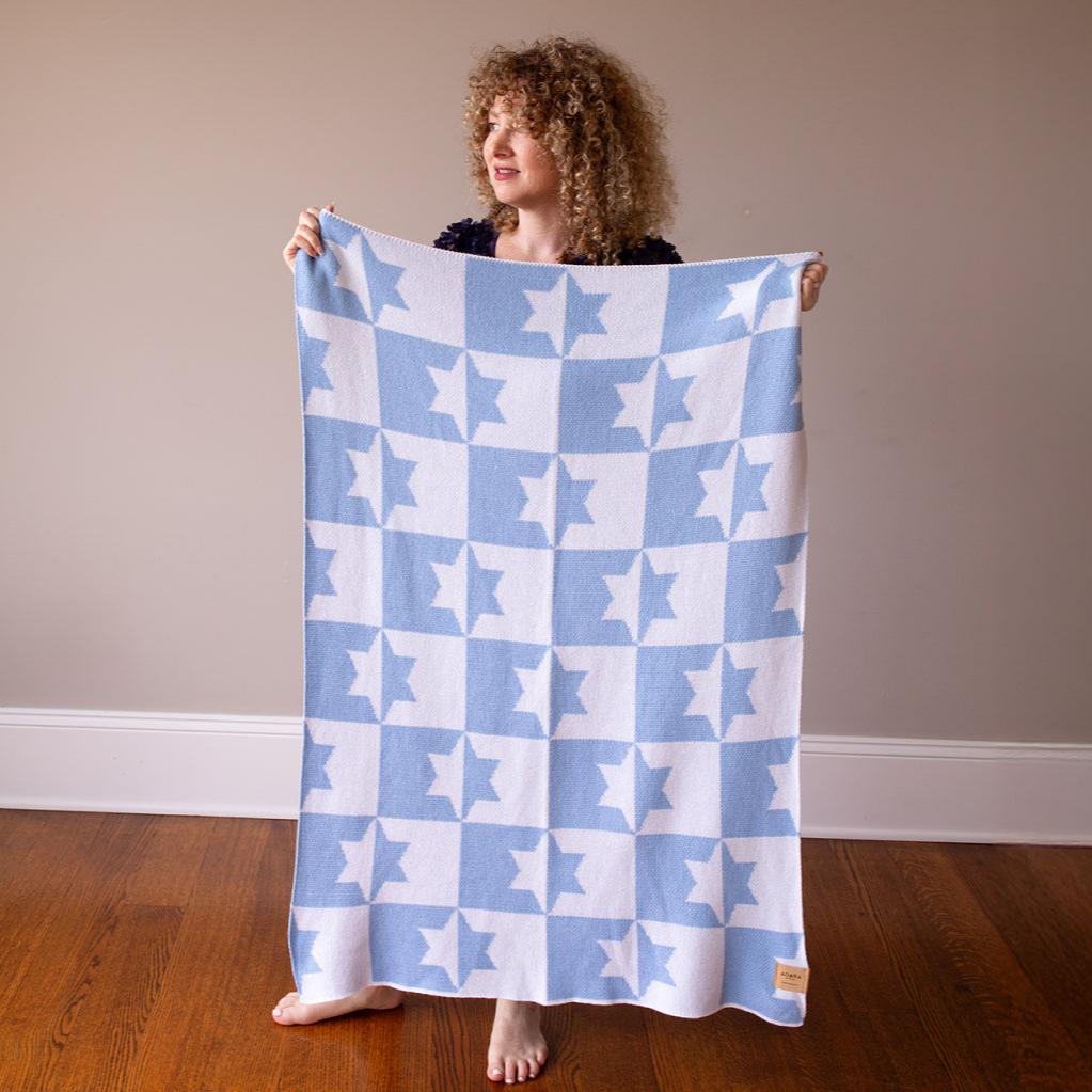 Wrap your little one in comfort and culture with our Star of David Baby Blanket in light blue and white. This ultra-soft, machine-washable blanket is crafted with care in the USA using a 50% recycled cotton and 50% recycled polyester blend. The reversible design features a beautiful Star of David pattern, symbolizing resilience and hope, making it both practical and meaningful. Perfect for everyday use, this heirloom-quality piece is designed to be a lasting family treasure, blending timeless style with Jewish pride.