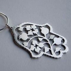 One of the most requested designs, this sterling silver hamsa is filled with the branch of a pomegranate tree. together these symbols offer wishes of protection and wisdom. The pendant hangs on a 18' sterling silver seamed snake chain.