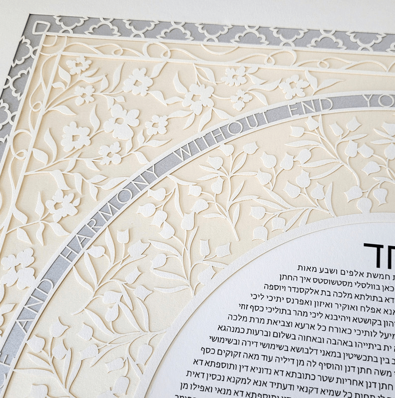 The Festive Ketubah collection includes varied combinations of floral and geometric and text borders.