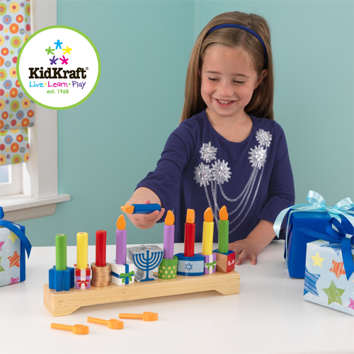 A colorful play menorah is super cute for kids by the American company Kid Kraft.