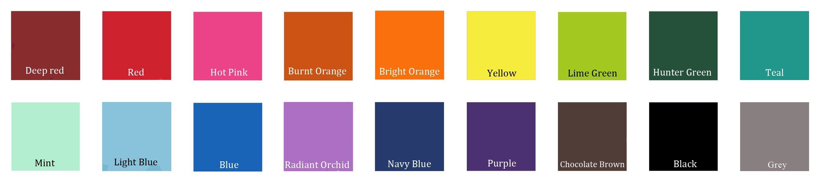 Color Options: Dark Red, Red, Hot Pink, Burnt Orange, Bright Orange, Yellow, Lime Green, Hunter Green, Teal, Mint, Light Blue, Blue, Radiant Orchid, Navy Blue, Purple, Chocolate Brown, Black or Grey.