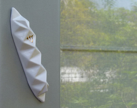 This mezuzah case has a modern geometric style inspired by the paper-folding art of Origami. The artist actually folds an Origami paper model, first, and then makes a ceramic version. This is a simply beautiful Jewish gift for a wedding or a chic gift for a new home.