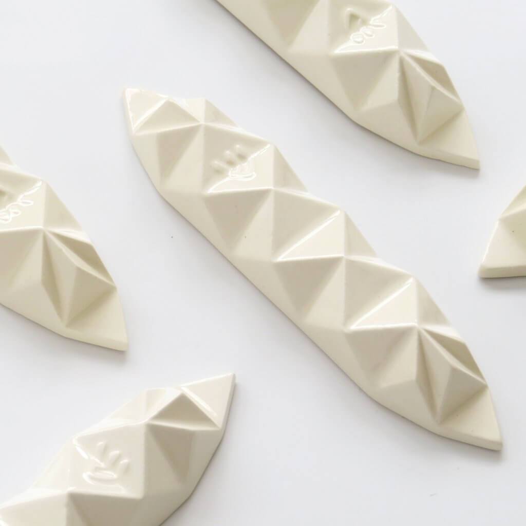 This mezuzah case has a modern geometric style inspired by the paper-folding art of Origami. The artist actually folds an Origami paper model, first, and then makes a ceramic version. This is a simply beautiful Jewish gift for a wedding or a chic gift for a new home.