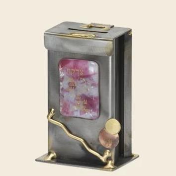 Tzedakah box with a piece of glass on the front in your choice of color with “Tzedakah” written on it along with the quote “With each child, the world begins anew.” Perfect new baby gift.